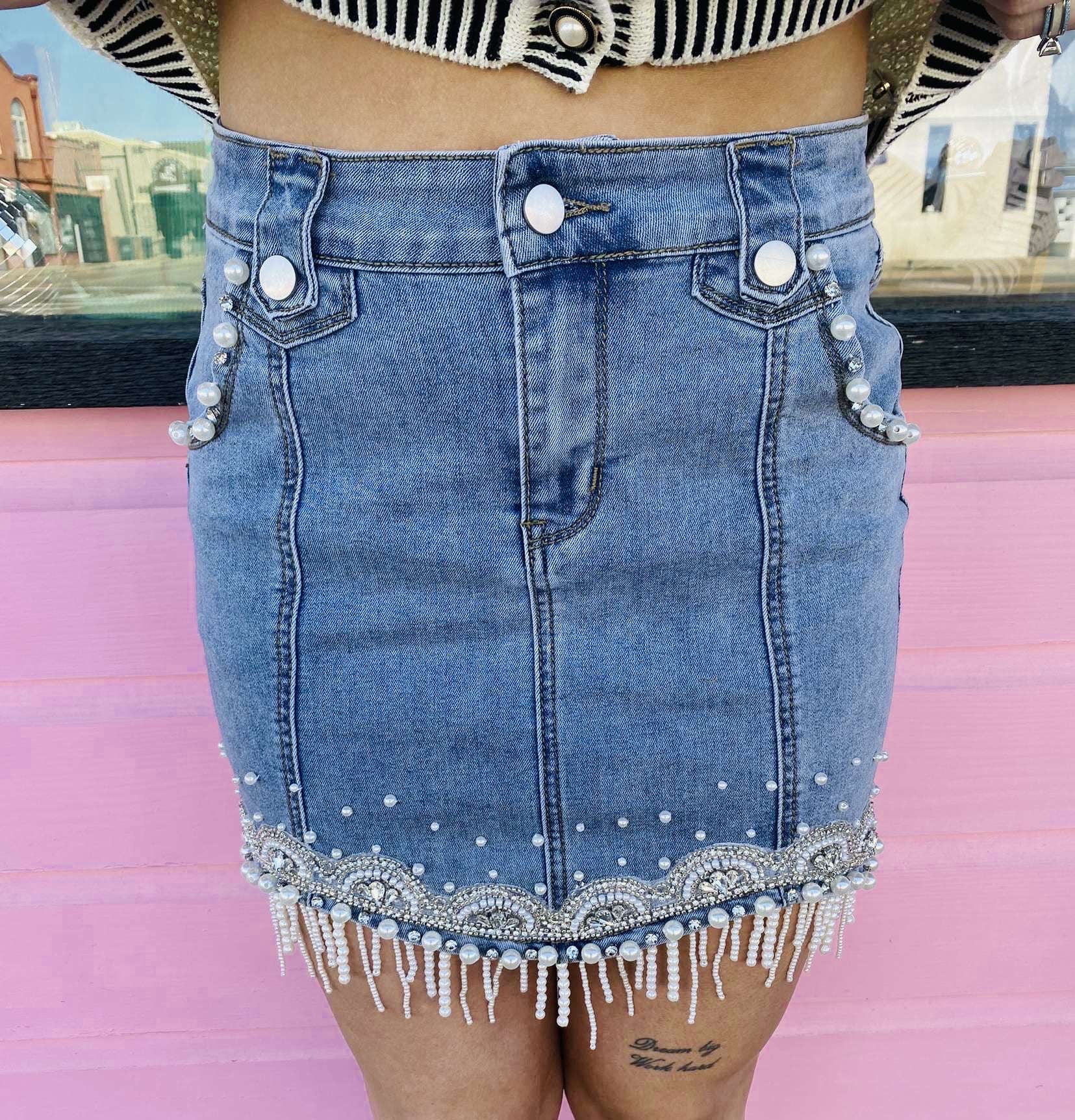 Denim Pearl Fringe Mini Skirt