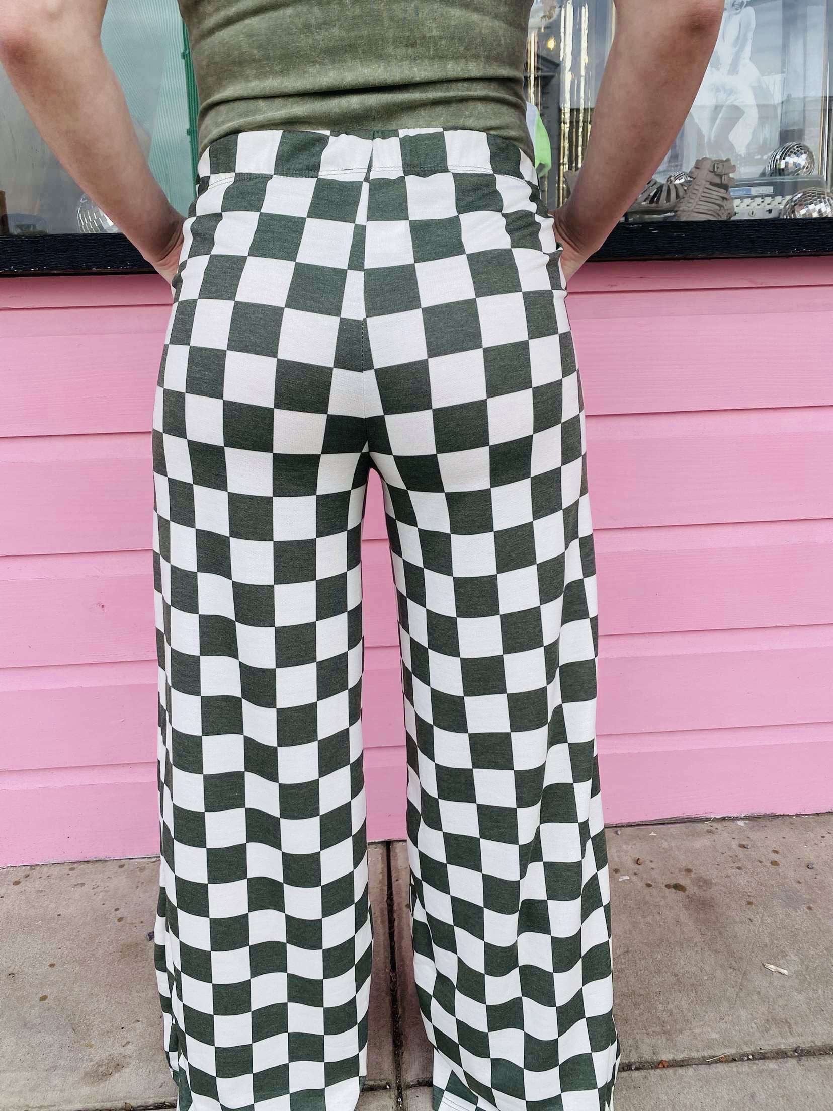 HIGH WAIST CHECKERED STRAIGHT LEG KNIT PANTS -Comfy elastic waistband -Wide leg fit • Fabric: 80% Polyester, 15% Rayon, 5% Spandex